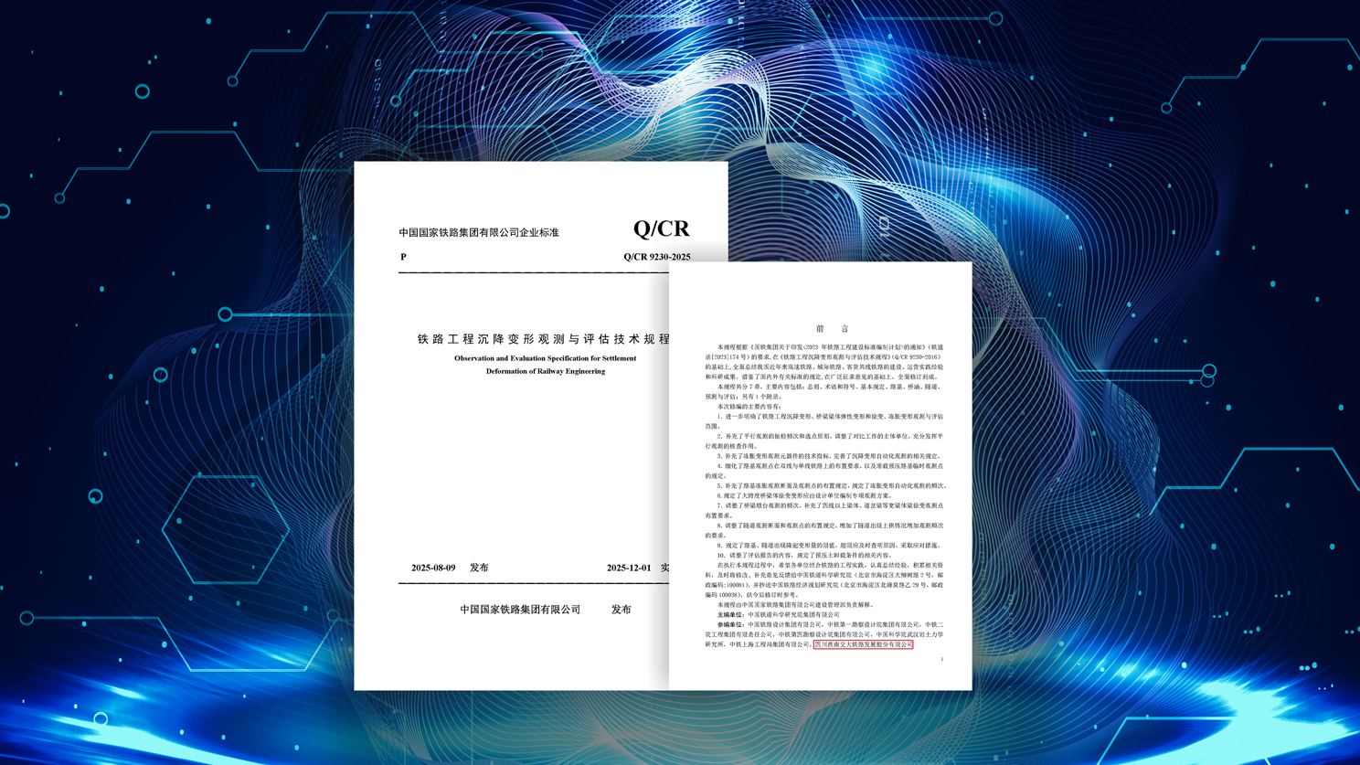 公司参与编制的又一项企业标准正式发布实施 [2025-12-02]2025年12月1日,伟德国际1946参与编制的中国国家铁路集团有限公司企业标准《铁路工程沉降变形观测与评估技术规程》(Q/CR 9230—2025)获准发布并实施。 该规程适用于新建和改建铁路工程沉降变形的观测与评估,对统一铁路工程建设期间沉降变形观测与…