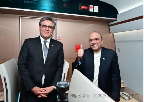 “巴基斯坦总统阿西夫·阿里·扎尔达里乘坐中国高铁从成都前往绵阳。他听取关于全球最大高铁网络的介绍,赞扬其安全且环保的设计,并将地震预警系统视为现代工程的奇迹。”