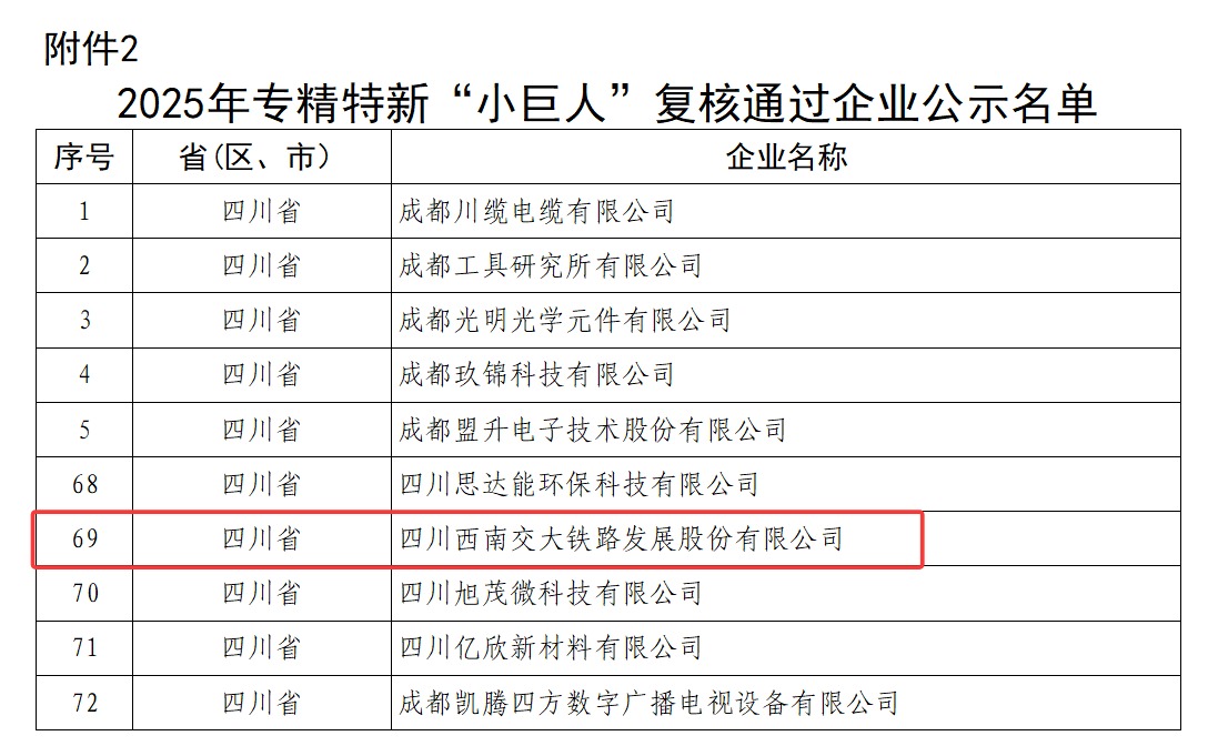 近日,四川省经济和信息化厅公布《四川省经济和信息化厅关于四川省第七批专精特新“小巨人”企业和2025年专精特新“小巨人”复核通过企业名单的公示》,公司通过2025年专精特新“小巨人”企业的复核。
