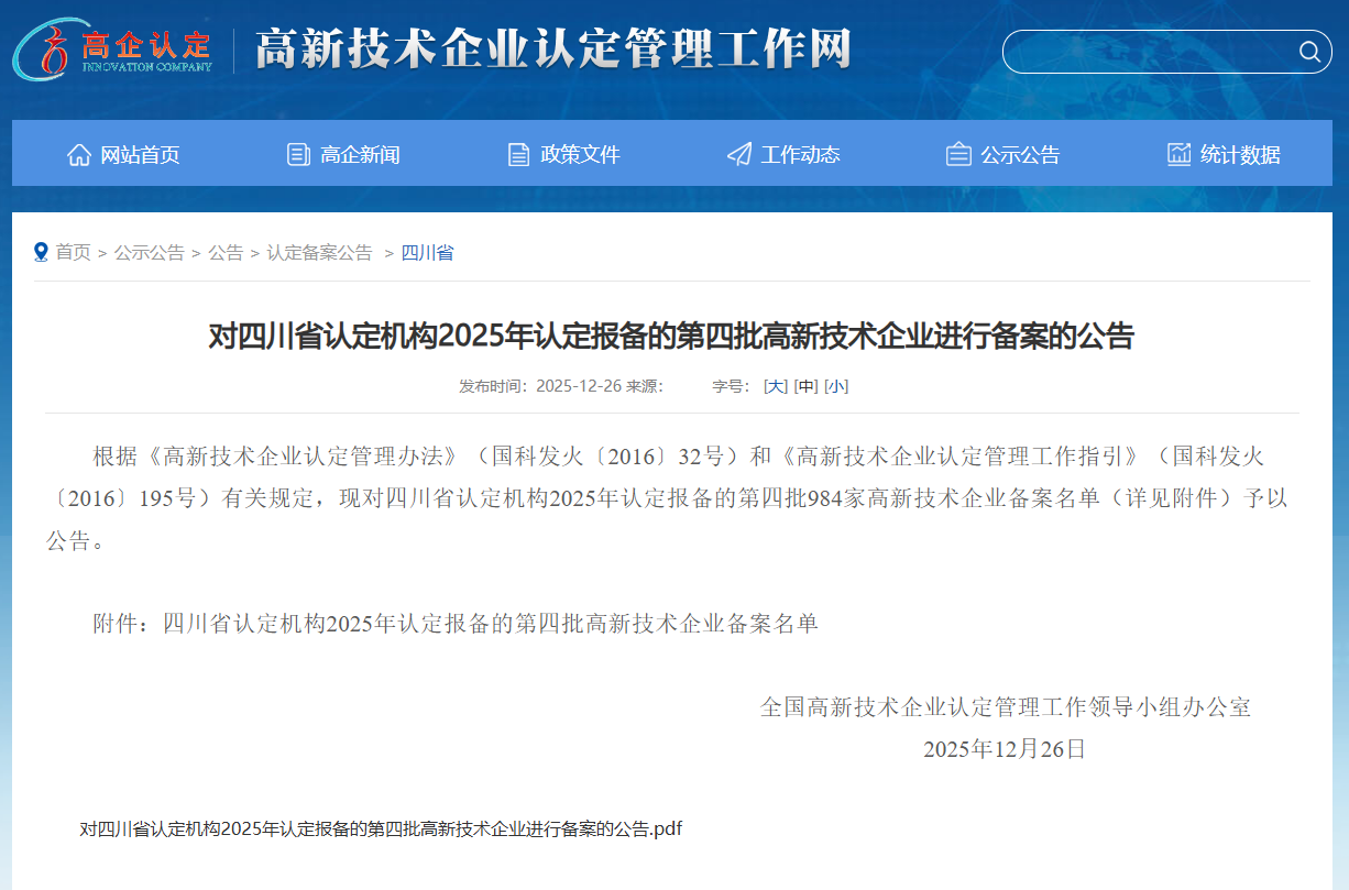 近日,全国高新技术企业认定管理工作领导小组办公室发布《对四川省认定机构2025年认定报备的第四批高新技术企业进行备案的公告》,公司凭借扎实的技术研发实力、突出的创新成果,成功再度荣获“国家高新技术企业”认定!